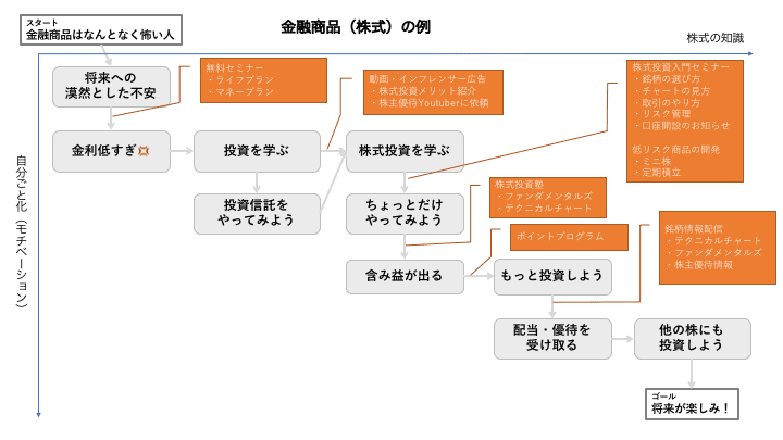 スタートからゴールに至るまでの顧客の心理変容のステップを書く