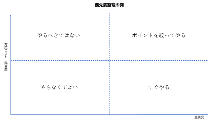 重要度が高く、対応コストが低いものが、優先度の高い施策となる。